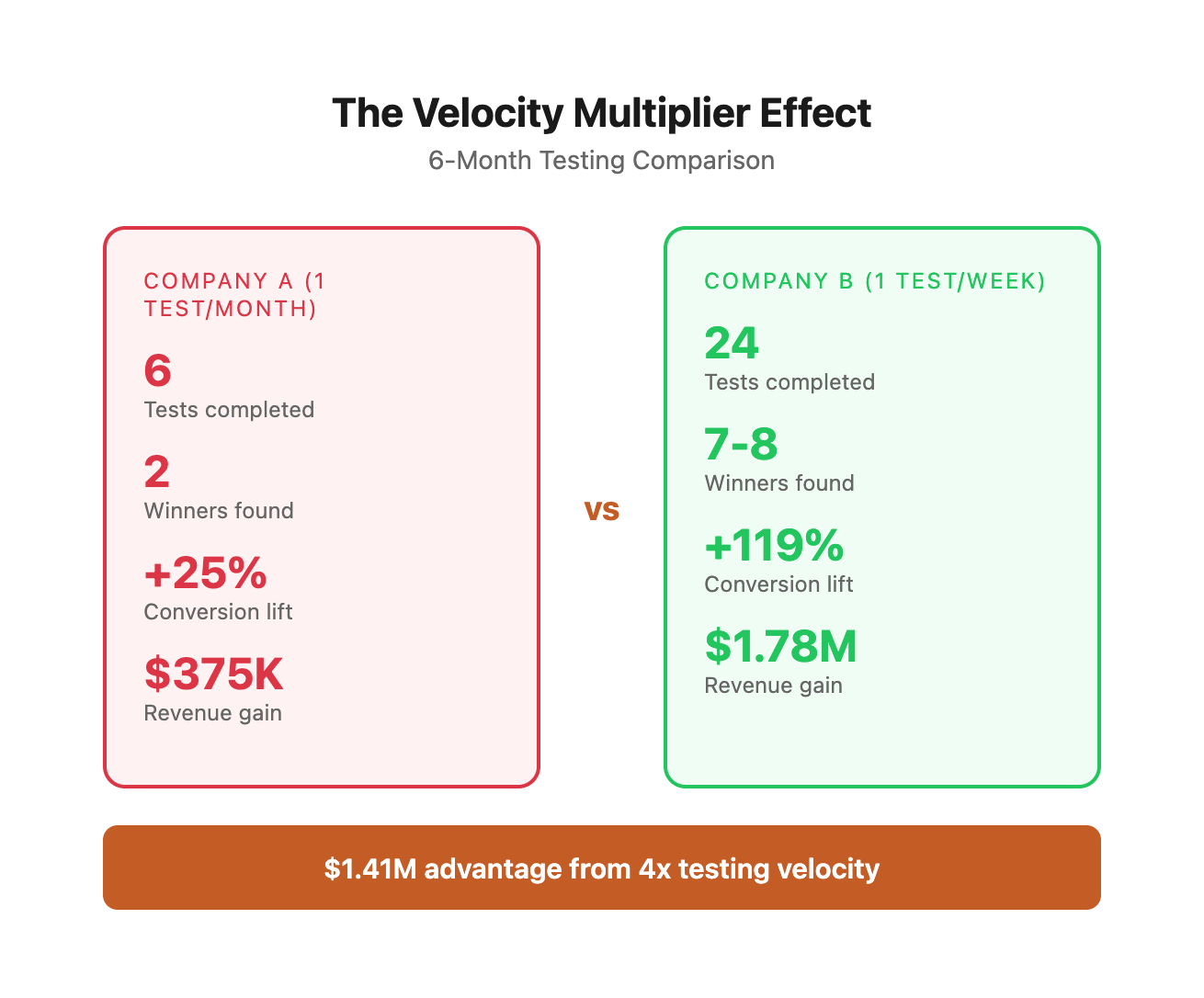 Learning velocity advantage: Company B has tested 4x more hypotheses, which means they understand their customers 4x better, creating a knowledge moat that widens over time.