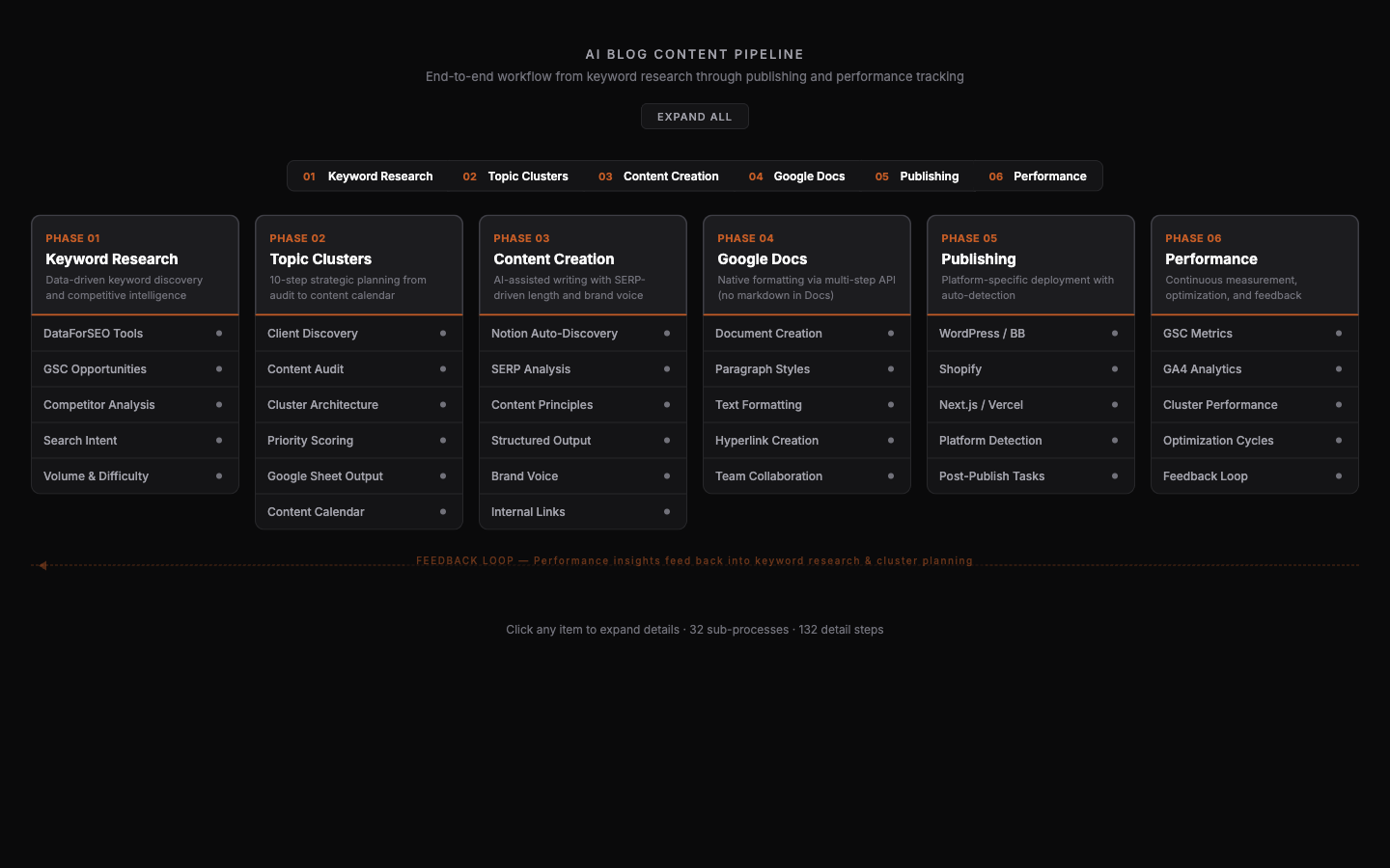 When you expand every phase, the pipeline contains 32 sub-processes and 132 individual detail steps. Each one maps to a specific tool, API endpoint, or decision point in the workflow.