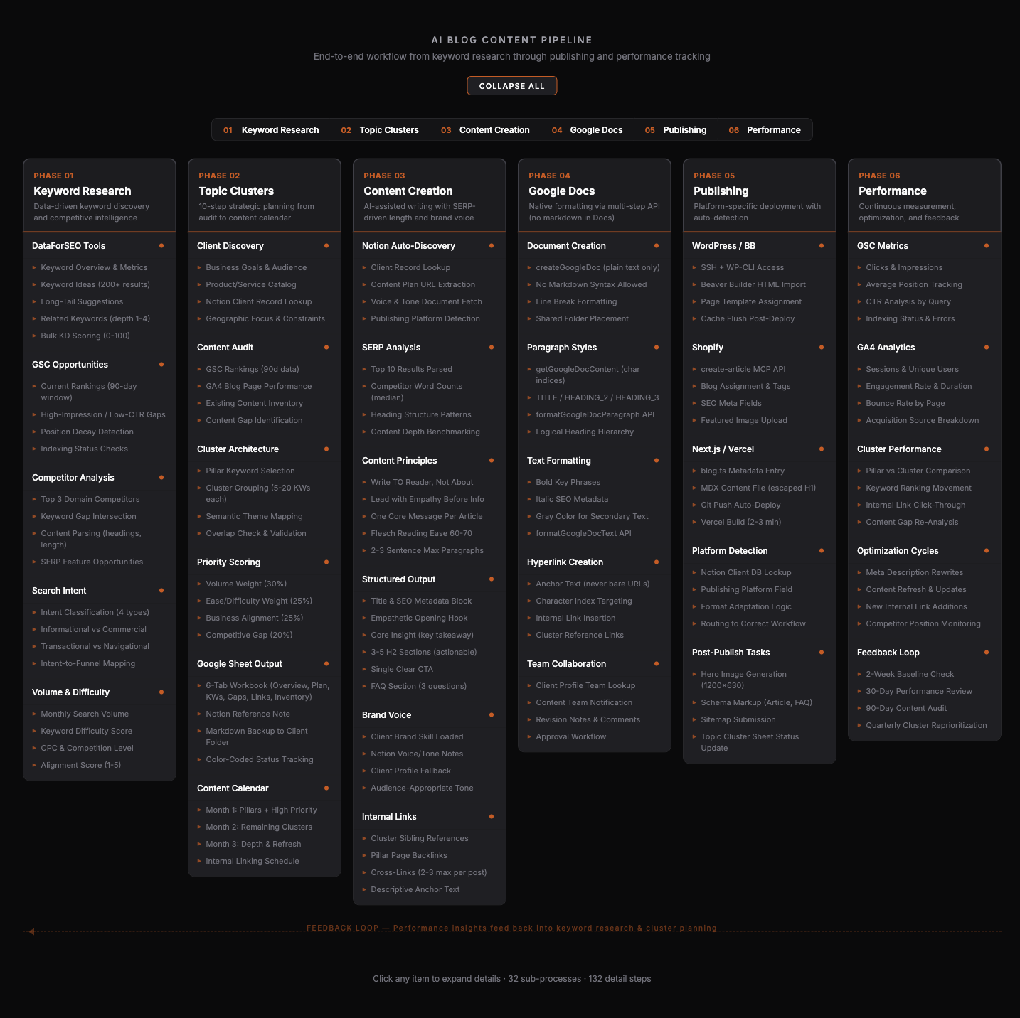 We built something different. Over the past year, WE-DO has developed a six-phase AI blog content pipeline that connects keyword research directly to publishing and performance tracking, with every phase informed by real data and automated through AI tooling.