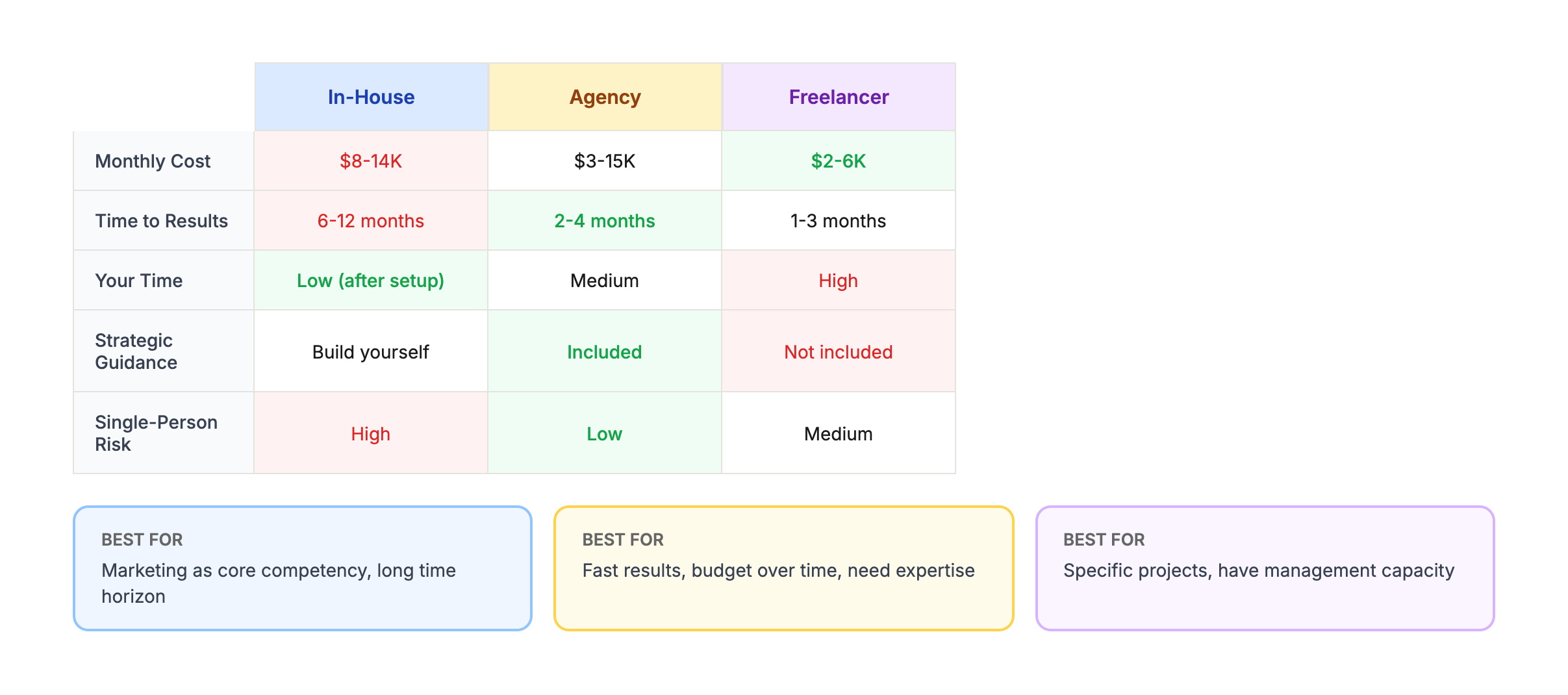 Choose in-house if: Marketing is core to your business, you have patience for a learning curve, you want to build proprietary capability, and you can afford the full cost (including risk of that person leaving).