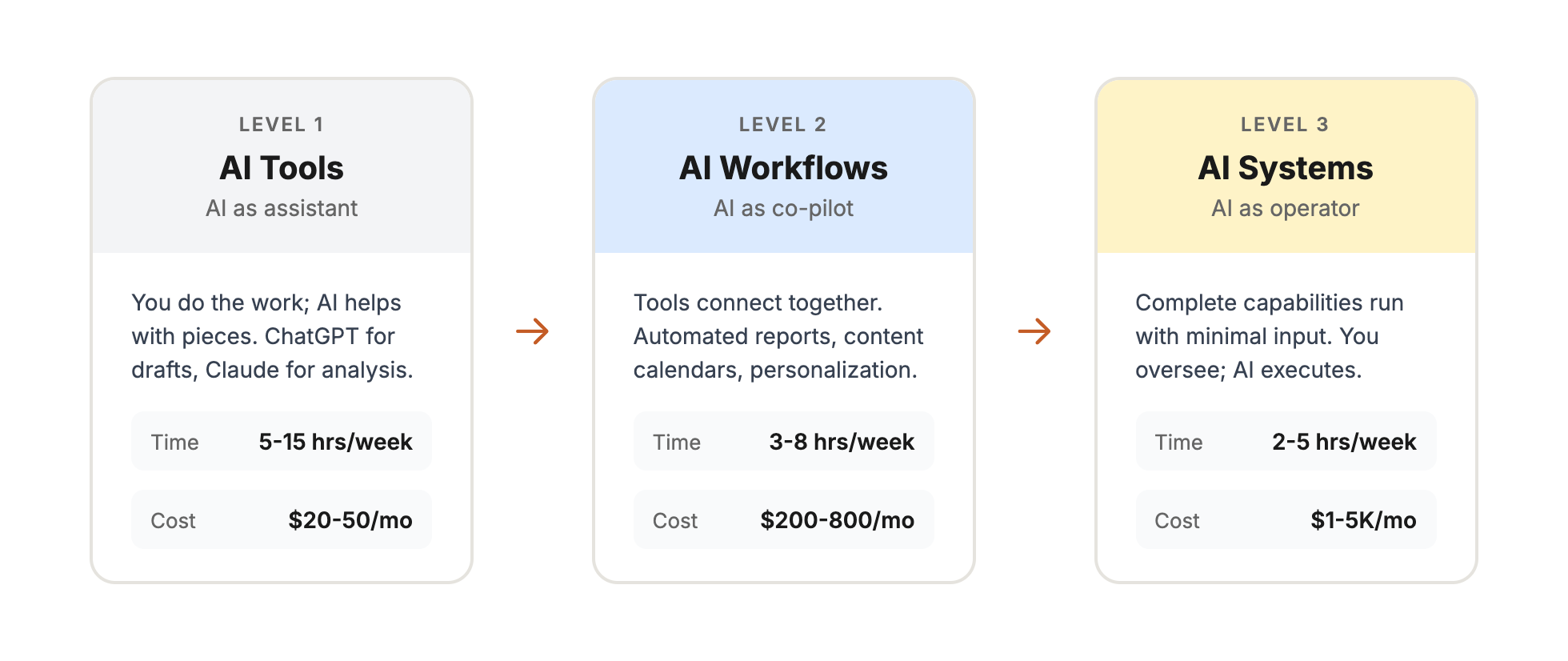 But "AI marketing" isn't one thing. It's a spectrum, and most confusion comes from people conflating different levels: