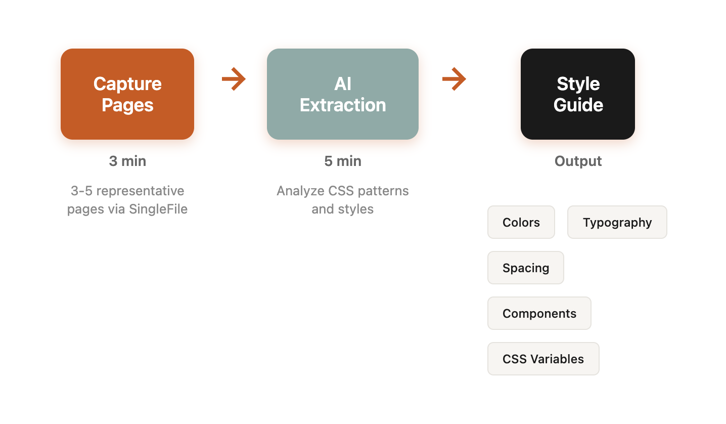 AI-powered style guide extraction does this in 15 minutes. Point it at a website, get a complete web style guide with CSS variables, typography scales, and component patterns.
