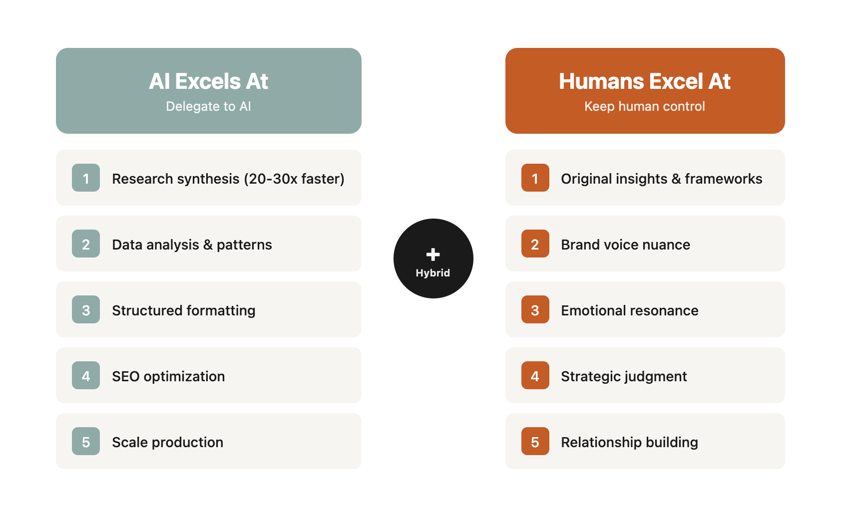 The goal isn't to replace humans with AI—it's to amplify human expertise with AI efficiency. Get that balance right and you'll produce more content, faster, without sacrificing the quality that drives results.