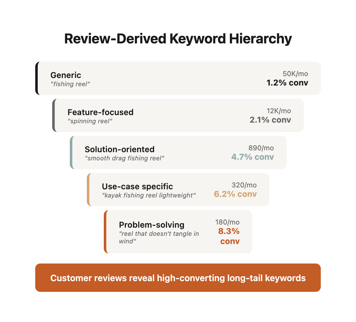 Traditional keyword research tools show aggregate search behavior, but they miss the nuance of how people think about and discuss products. A tool might tell you "fishing rod" gets 50,000 monthly searches. But reviews tell you that people actually search for "lightweight bass fishing rod for all-day casting" and "sensitive tip fishing rod for light bites." These long-tail variations often have lower competition and higher conversion rates.
