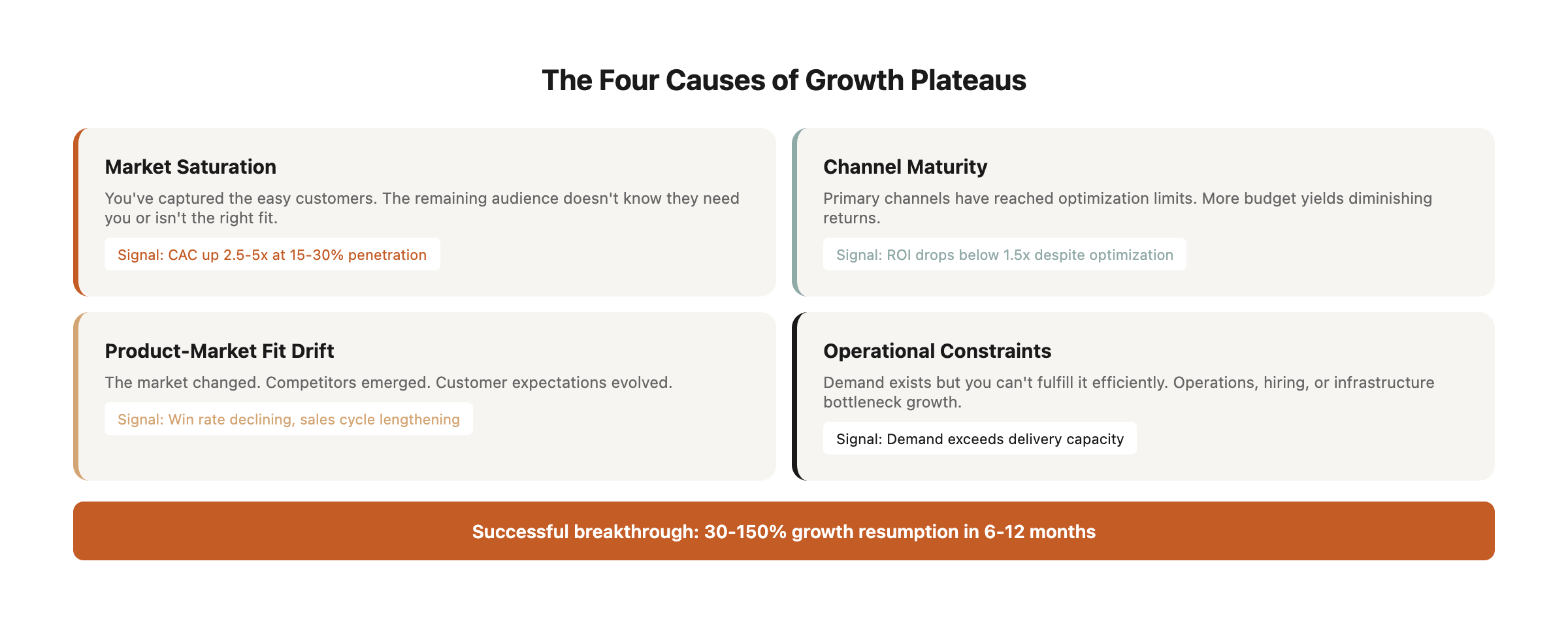 Example: Your plateau is caused by checkout abandonment rate of 78% (vs. industry average of 65%). This isn't a market problem—it's a user experience problem with known solutions.