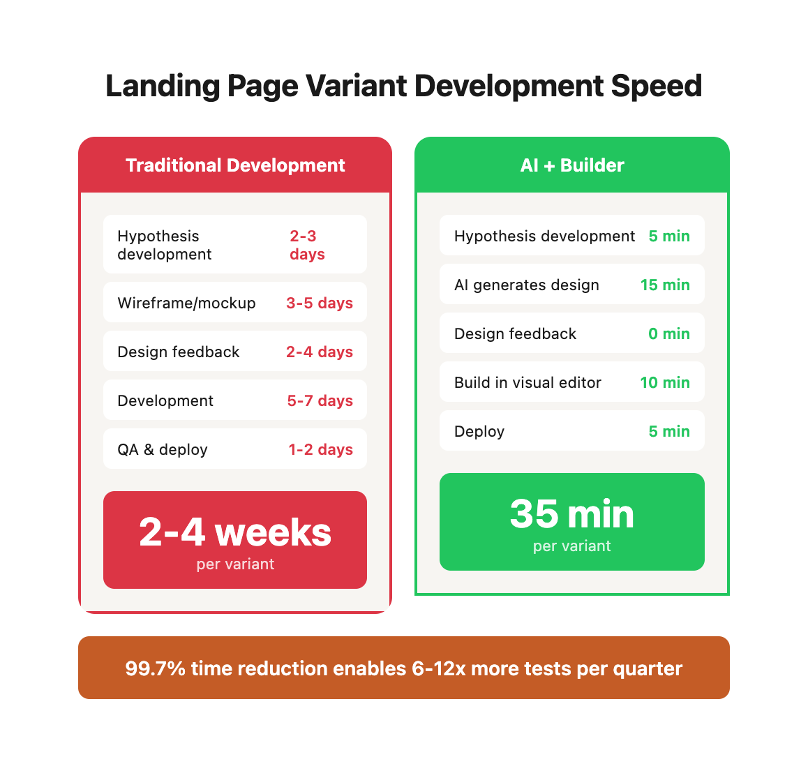 This speed advantage compounds. Traditional teams test 1-2 landing page concepts per quarter. AI-accelerated teams test 8-12 variants in the same period, learning exponentially faster.