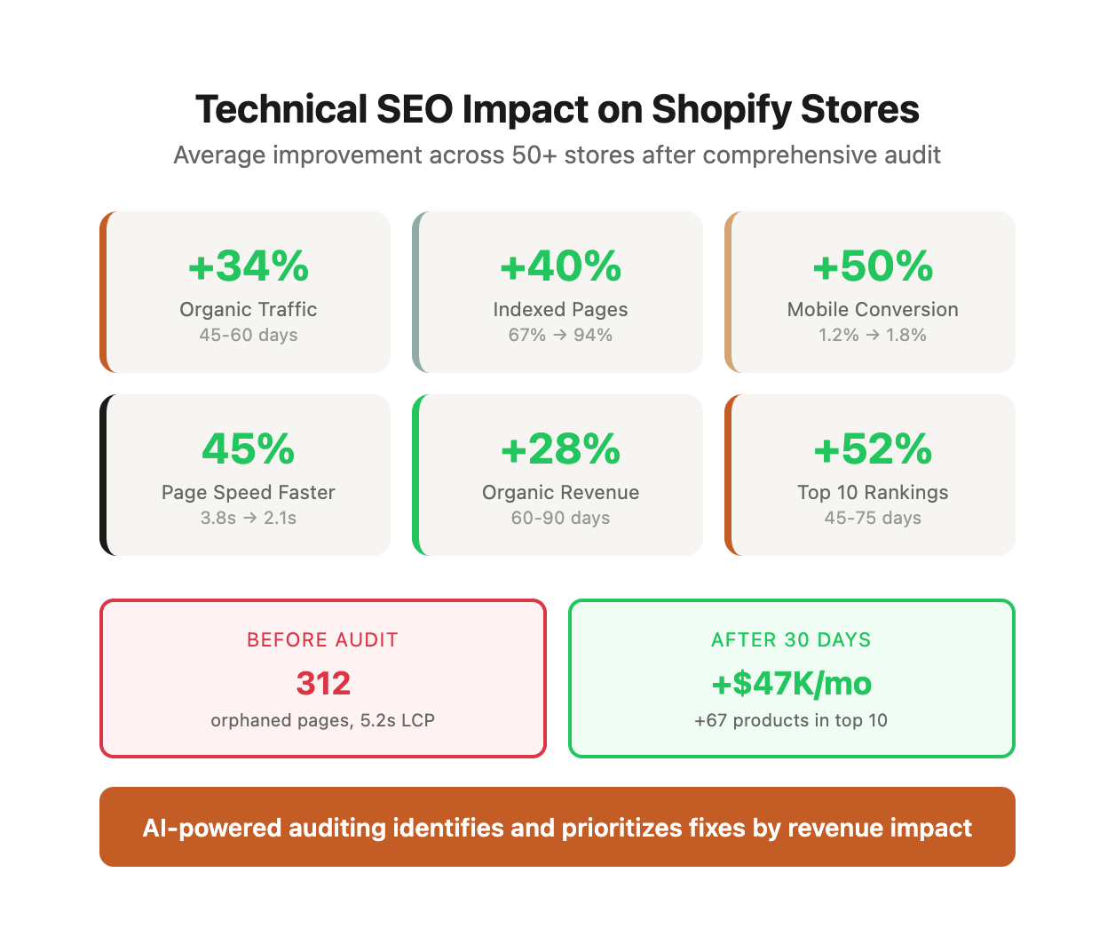 Technical SEO isn't just about pleasing Google. It directly impacts your bottom line. Here's what we've measured across 50+ Shopify stores after comprehensive technical audits:
