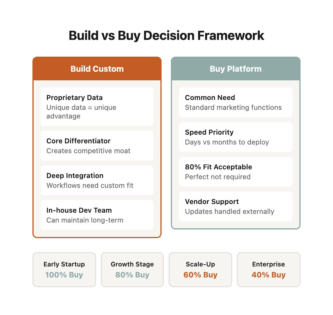 Build when: Your competitive advantage comes from unique data that generic tools can't leverage.